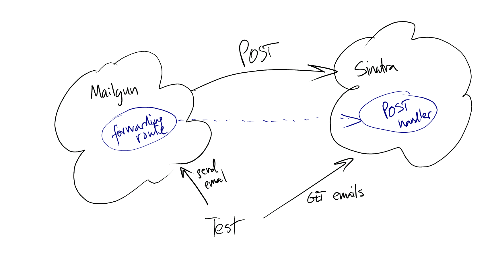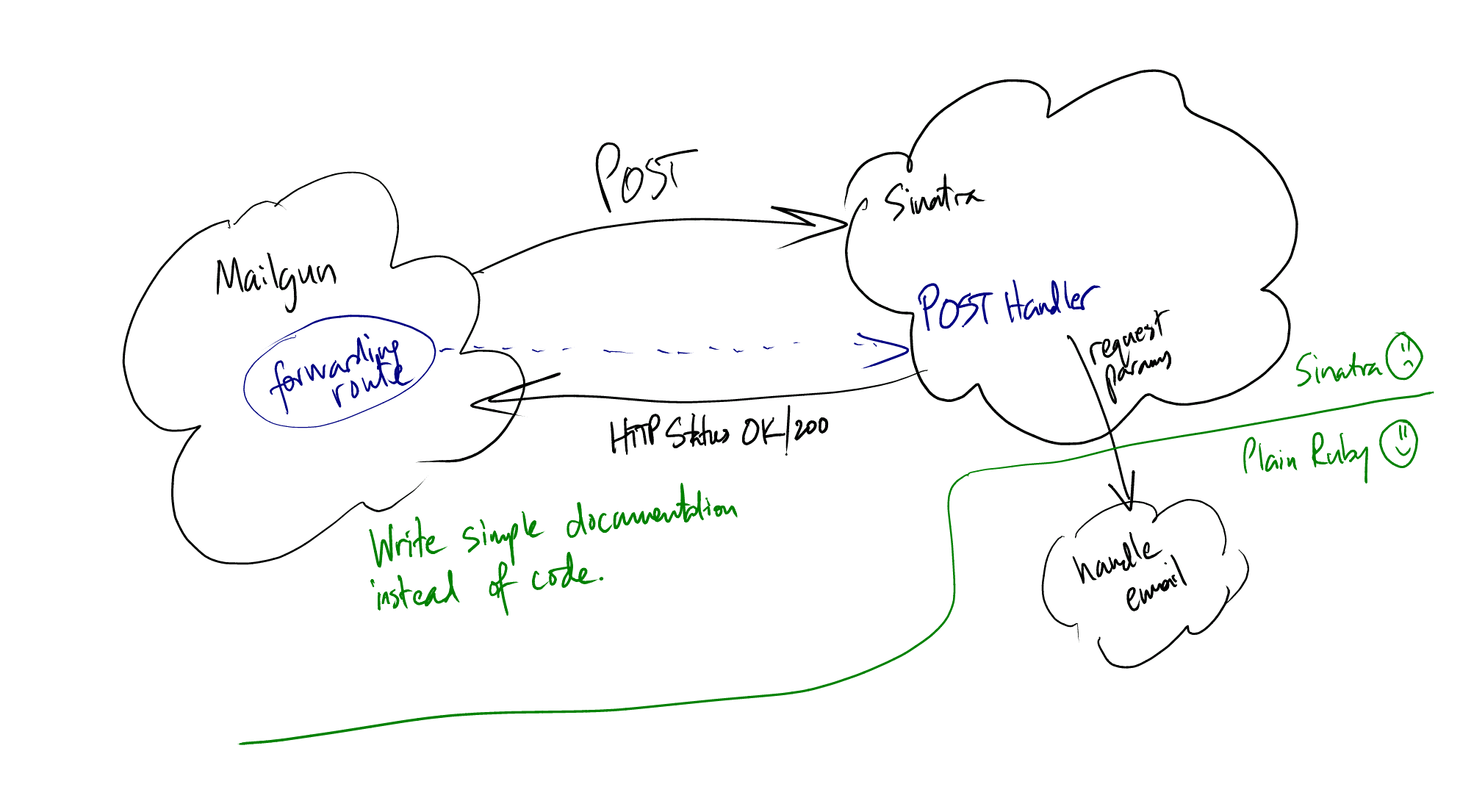 Excellent. I have enough information about the contract between Mailgun and a POST handler that I can design my Sinatra application. I can even test-drive it! (Don’t mind the diagram. I promise that I’ll return the appropriate HTTP status code when things go wrong.)